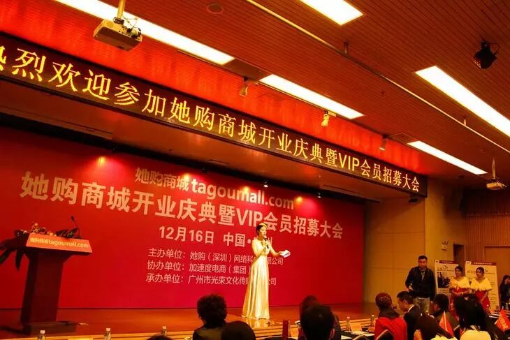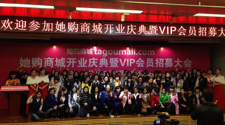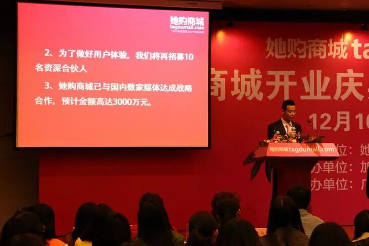 2015年12月16日,她购商城开业庆典在广州隆重举办。 她购商城创始人兼CEO陈鹏先生、她购商城联合创始人兼市场总监何敬超先生、著名天使投资人、金色大地集团董事长易小华先生、知名女性爱情导师严佩小姐、国际知名时尚买手KK小姐、国际时尚设计师李白华小姐及资深媒体人刘坦然小姐等嘉宾出席了本次庆典,各行业优秀精英、企业家、会员代表、媒体记者等近800人出席了本次庆典。 广东电视台、南方电视台、腾讯新闻、土豆网等主流媒体重点报道。 她购商城是一家只卖高品质女性产品的购物网站,致力于为用户打造一个线上线下相融合的时尚生活服务圈。 她购商城创始人兼CEO陈鹏发表重要讲话,提出她购商城战略目标和远景规划,并面向众多媒体和来宾,郑重承诺:网站销售总额的千分之一将无偿捐献公益事业。 1、2016年1月1日凌晨,她购商城正式上线开卖; 2、为更好的做好用户体验,从女性自身角度出发。我们将再招募10名资深合伙人; 3、2016年全面启动她购市场推广活动,已经与国内数家电视台、网络媒体、报刊、杂志等媒体达成战略合作,预计金额高达3500万元。 4、为更好的服务用户,开展线下体验活动,将会陆续在北京、上海、成都、武汉、济南、杭州等一线城市开设分公司,预计2020年分公司数量达15家。 5、公司预计2016年完成B、C轮融资,预计2018年成功上市。 此外,庆典当天是陈总母亲生日,现场一起祝福陈母生日快乐,场面感人温馨。 联合创始人兼市场总监何敬超上台发言,宣布2016年市场推广计划及VIP会员8大福利,现场限额招募300名VIP会员,现场引起轰动。 VIP会员代表、资深媒体人刘坦然小姐台上发言,表示选择成为她购VIP会员的原因是因为她购能给到其他电商平台不能给予的福利,如免费随公司组织参加公益活动,免费自驾游、免费学习电商知识等。更重要的是能够和全国各地的一群志趣相投的姐妹们为她购发展提建议,是很好玩,很有趣的事情。 创始人、投资方及会员代表接受媒体自由提问 隆重的剪彩仪式 VIP会员招募现场火爆,500个名额一抢而空 抢到名额的VIP会员接受媒体采访 部分现场报名的VIP会员大合照 现场抽奖互动,观众热情高涨 会后,创始人被记者包围,争抢提问 这是她购商城的开业庆典,更是她购步入社会成长开始的起点。如果说她购就像一轮冉冉升起的朝阳,那么各位关注她购的人,就是拥抱朝阳的人!她购商城全体同仁衷心感谢每一位支持她购的粉丝。她购有你,更精彩!