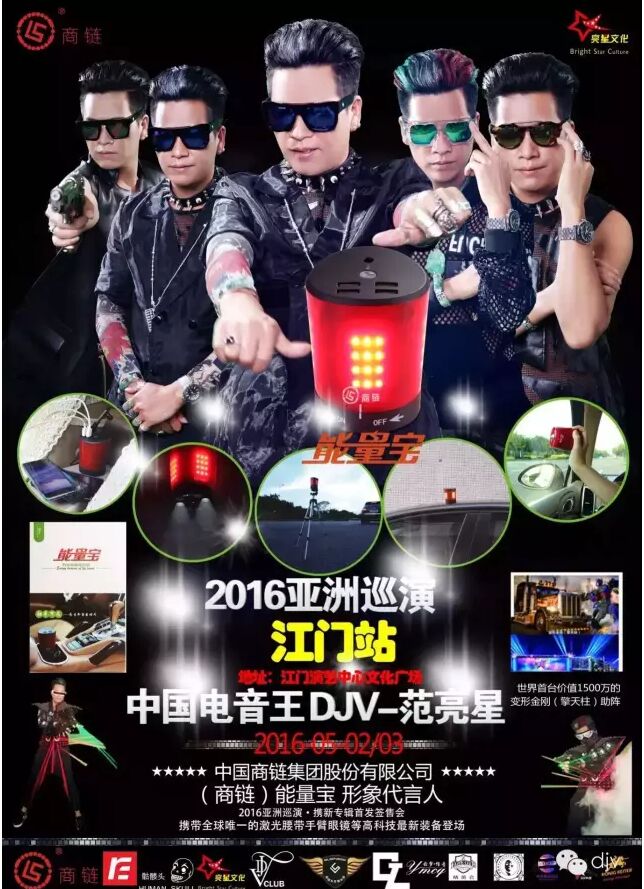 中国电音王-DJV-范亮星(亚洲巡演)江门站、门票疯狂抢购中 购买门票赠送DJV个人签名专辑一张、 江门市演艺中心文化广场、 2016-04-07 djv 2016亚洲巡演江门站DJV来了! 中国电音王-DJV-范亮星(亚洲巡演) 江门站、 门票疯狂抢购中 let`s go! 购买门票赠送DJV个人签名专辑一张、还有你想不到的惊喜哦! 中国商链能量宝形象代言人DJV约定你! 时间:【2016-05-02/03】 晚上19:30-22:00 地址: 江门市演艺中心文化广场、 DJV与你不见不散! DJV荣幸为《银指头》银饰品牌、形象代言人![强][握手][胜利] 中国商链集团《商链-能量宝》DJV-形象代言人-中国电音王DJV-范亮星-最新电音专辑-已经封面设计好!即将出炉!新闻发布会四月中广州举行!敬请期待! 深圳市艾帕酒业贸易发展有限公司(原浆红)葡萄酒 形象代言人 传说中的国际男神男模一不小心就这样诞生了! 中國电音王-DJV(范亮星)著名混音师 金牌经纪人 知名演员: DJV于96年入DJ行业,由其制作的大量流行舞曲被广泛流传, 全亚洲地区已发行十余张个人舞曲专辑, 并走遍10多座城市举办混音专辑-舞迷签售会, 2009 荣获“金飞龙奖”中国流行乐坛最具影响力DJ音乐制作创新人物奖 2010 荣获奖项 中国首届娱乐金樽“十大音乐人 2012 担任华南广播电影电视传媒集团音乐部总裁。 2013 深圳亮星文化传播有限公司:创始人-兼-CEO 2014 DJV科技防狼手机:(创始人) 2014 DJV全国连锁酒吧:(创始人) 2014 中国豪车联盟:常务(理事) 2014 中国精英会: 常务(理事) 2014 中国流行音乐:常务(理事) 2014 中国通用航空俱乐部:常务(理事) 2015 多彩中国.华语DJ金曲榜:(CEO) 2016广东省自驾游协会《佛山分会》形象代言人-兼-(副会长) 2016 爱和缘幸福集团 (爱和缘)(创始人之一)兼- 形象代言人 为上百位当红歌手制作舞曲混音和担任编曲、监制、 为中国舞曲音乐和流行音乐的发展做出了巨大的贡献。 为数十名歌手出演MTV男主角、 陈兴瑜《非你莫嫁》 李姝漫《不要再说我无理取闹》 陈 娇《做我的男人》 意玲Elaine《梦寐以求》等! DJV混音代表作: 凤凰传奇《最炫民族风》 阿木《有一种爱叫做放手》 徐誉滕《等一分钟》 郑源 《难道爱一个人有错吗》《怎么会狠心伤害我》 《一万个理由》 海鸣威 《我的回忆不是我的》 六哲 《错错错》《被爱过的心还可以爱谁》 高进 《我多想把你抱住》 《我的好兄弟》 陈楚生《有没有人告诉你》 张振宇《爱上你等于爱上了错》 容中尔甲 《高原红》《牧人之歌》 刘嘉亮 《你到底爱谁》《中了你的毒》 易欣《心碎》《无法证明》《你的选择》 宇桐非《感动天感动地》《擦肩而过》 斯琴高丽《犯错》《斯琴高丽的伤心》 雷龙 《爱走了心碎了》 《没有钱你会爱我吗》 《爱的越真伤得越深》 欢子《得到你的人却得不到你的心》 陈兴瑜《你说过爱我一万年》《你是我的罗密欧》 《非你莫嫁》 《非你莫嫁》 等上百位歌手舞曲混音作品。 DJV为10余家企业品牌 形象代言人<以下产品 泛美泓涵国际房车俱:(擎天柱)代言人 香港天合动力DJV科技投影裸眼3D视觉有限公司 代言人 深圳兴本色眼镜有限公司(骷髅头)代言人 香港伯翎顿珠宝有限公司(伯翎顿)代言人 深圳市天源水文章饮品有限公司(水文章)代言人 深圳市艾帕酒业贸易发展有限公司(原浆红)葡萄酒 代言人 广东大健生物科技股份有限公司(维京)鸡尾酒 代言人 幸能股份有限公司(幸能养生茶)代言人 广东皇家骑士贸易有限公司(皇家骑士)德国啤酒 代言人 广州卡佩尔酒业集团有限公司、(卡佩尔)形象代言人 广州ClOTHHOUSE(布衣斋)服装设计有限公司 中式男装代言人 少江南新会陈皮有限公司(少江南·陈皮)形象代言人 深圳市真艺装饰设计有限公司(真艺装饰)形象代言 【G.L】云梦传奇护肤品 形象代言人 DJV轮胎升级(免补防爆耐扎)形象代言人兼联合创始人兼CEO 广东电视台移动TV少儿频道 授予公益 形象大使 先锋Pioneer DJ金牌代理商-深圳市聚龙灯光音响器材有限公司荣誉形象代言人 广东省雅戈卡罗服饰有限公司、旗下六个服装品牌、雅戈卡罗,弗朗卡罗,弗朗卡,冲锋联盟,崇生,何格。形象代言人 中国商链集团(商链-能量宝》形象代言人、 爱和缘幸福集团 (爱和缘》形象代言人、 DJV正式涉足影视圈出演 《侦查爱情》《幻影移形》《沸腾的青春》《晶晶囧囧帮》 《爱在喜玛拉雅》《爱上坏小子》《爱在深秋》 《当饺子遇上旧吉他》《机灵小子》 等多部电影出演及多部电影配乐。 担任深圳《新城杯》 《环球小姐》 《CCTV非常6+1》等卫视节目评委 充分展现其多才多艺的艺术才华,堪称艺术界“大亨”。