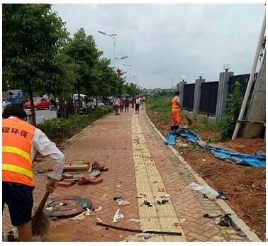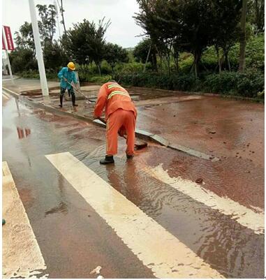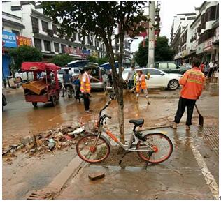 近日,湖南遭遇暴雨连袭, 6月份全省平均下了20.5天的雨,长沙遭遇了有水文记录以来的最大洪水,水位超历史记录30度公分。 一位湖南辰溪网友发布的水灾前后对比图 雨后的榔梨镇 被洪水冲刷的不堪路面 侨银环保长沙项目全体员工出动,启动了紧急预案措施,及时为灾后的榔梨进行清理整治,还市民一个舒适清洁的环境。 街道泥沙清理 垃圾清运 道路及路旁设施清扫 街道排水疏通 洒水车冲洗路面 连续奋战的员工就地用餐,有些人甚至已连续作业超过18小时 连续的暴雨带来街道泥泞,路面洪流积水,暴风刮过的泥浆砂石、四处散乱的杂物,堵住了人们出行的街道……面对恶劣的灾后环境,侨银环保长沙项目全体员工快速响应,清理整治工作有条不紊地进行。虽然灾后保洁工作尤其艰苦,但看到渐渐归于平静、整洁的街道,员工们心里都很舒坦。 7月2日,风雨过后,艳阳高照,在侨银人的努力下,榔梨镇的人们终于恢复平安出行了,有序整洁的街道显得格外美丽!