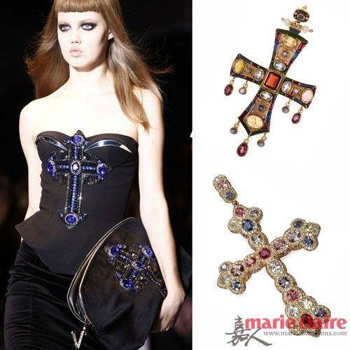 Givenchy的创意总监Riccardo Tisci 对于十字架符号的运用有着自己独特的情结,他对黑暗美学和哥特风格非常着迷,其设计有着兼具现代感和浪漫情怀的优雅气质。也许是因为自小生长在一个十分虔诚的天主教家庭中,Tisci的设计受宗教的影响非常深刻,尤其是他喜欢把十字架装饰广泛地用在他的设计作品当中。