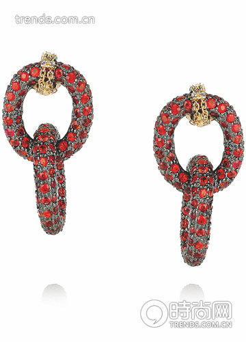 红色是最刺激、最鲜艳,给人印象最强,最显眼的色彩。穿上浓郁的大红色,能衬托出美丽的肌肤。登上红色的高跟鞋,无人能把视线从你的脚上移开。环扣形水晶耳环 Carolina Bucci