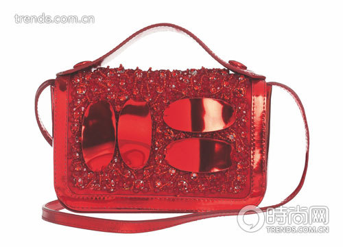 红色是最刺激、最鲜艳,给人印象最强,最显眼的色彩。穿上浓郁的大红色,能衬托出美丽的肌肤。登上红色的高跟鞋,无人能把视线从你的脚上移开。水晶装饰单肩包 Moschino