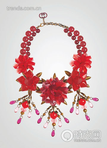 红色是最刺激、最鲜艳,给人印象最强,最显眼的色彩。穿上浓郁的大红色,能衬托出美丽的肌肤。登上红色的高跟鞋,无人能把视线从你的脚上移开。花形水晶装饰项链 Gucci