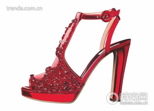 红色是最刺激、最鲜艳,给人印象最强,最显眼的色彩。穿上浓郁的大红色,能衬托出美丽的肌肤。登上红色的高跟鞋,无人能把视线从你的脚上移开。水晶装饰高跟鞋 Moschino