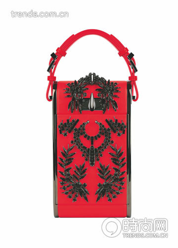 红色是最刺激、最鲜艳,给人印象最强,最显眼的色彩。穿上浓郁的大红色,能衬托出美丽的肌肤。登上红色的高跟鞋,无人能把视线从你的脚上移开。黑色水晶装饰相机包 Givenchy by Riccardo Tisci