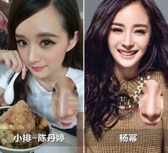 两个人的鼻梁都非常直,非常挺,这样没有动过刀的亚洲MM只能望尘莫及。十分立体的鼻梁,让两个人面部结构一下也都立体起来。不过仔细对比会发现,“小排-陈丹婷”的鼻翼要比杨幂略宽(当然,这也不能排除是杨幂的造型师利用阴影),而杨幂的鼻头要比“小排-陈丹婷”更加“勾”。