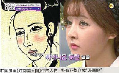 而现在,终于有人开始走不同路线。韩国综艺节目《火星人病毒》中露面的女子朴有亚,就将自己整成了漫画风格的“圆脸”,她的脸型被大家发现特别像韩国漫画《江南美人图》中的人物。朴有亚自称《江南美人图》中的人物就是自己的“肖像画”,因此主动上节目,与大家分享。