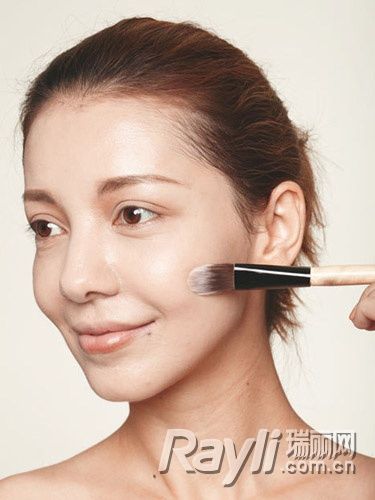 在粉底中混合有柔光效果的产品,用粉底刷或海绵上妆,在鼻翼两侧和眼下多按若干次,上妆时要尤其注意耳后和脖子部位。