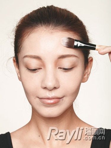 用中号阴影刷,将哑光深色修容粉从眉头开始,一直晕染延伸到鼻翼两侧。修饰时颜色过渡要自然,否则反而更容易强调缺点。