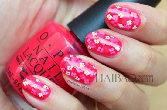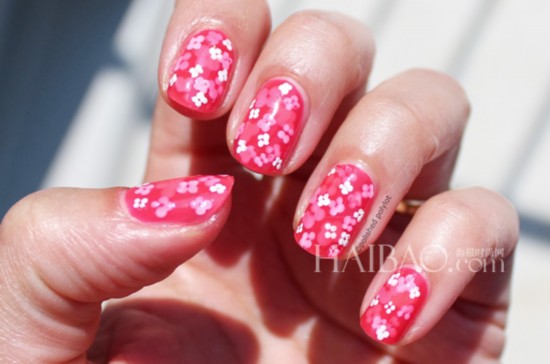 超Sweet粉红花朵美甲:约会造型一定要甜美,如何衬托出你那粉红菲菲般的恋爱心情呢?粉红色的花朵美甲最合适了!先用粉红色的指甲油进行打底,之后再准备白色和浅粉色的美甲笔在指甲上戳出花瓣的形状,一款超Sweet的花朵美甲就完成啦。