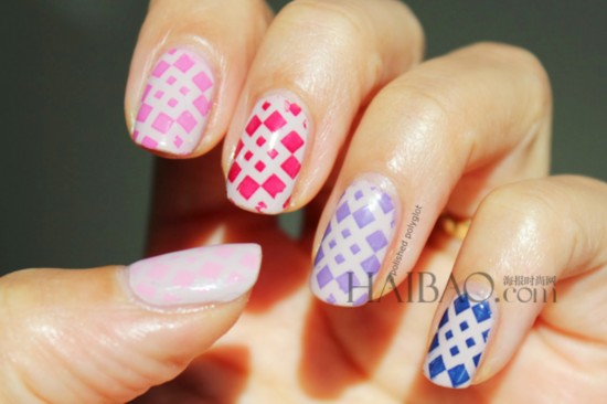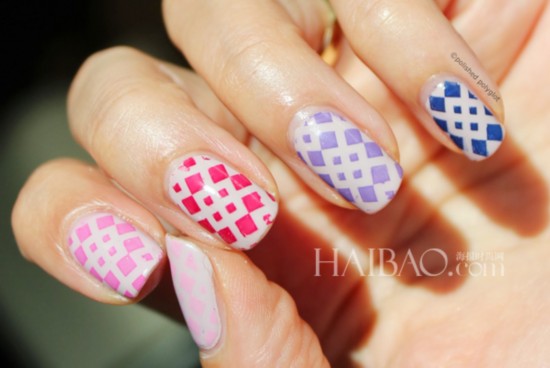 方格彩色印花个性美甲:经典的方格造型好像烙印一样印在指甲上的美甲很有创意,实际操作起来也没那么难,先用淡紫色的指甲油打底。选好色号后,在模板中填上色,之后再撤掉美甲模板,简单的彩色方格美甲就完成了。