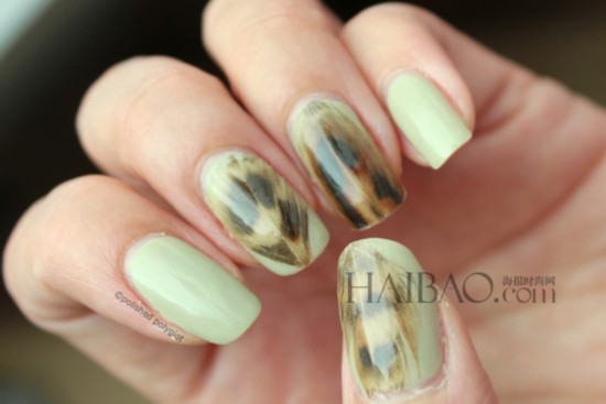 轻盈羽毛风情美甲:玩腻了各种花纹的美甲造型不如来看这组创意无限的美容博主美甲,首先用淡绿色的指甲油进行双层打底确保遮盖度,之后在手指及无名指贴上两片你喜欢的羽毛造型,最后再用透明色的护甲油涂在指尖进行固定。