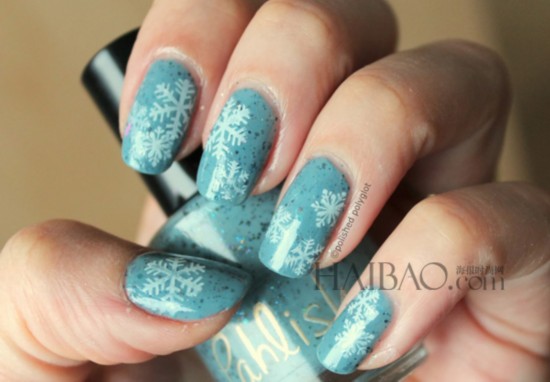 应景冬季雪花贴片美甲:最能代表冬季特征的美甲造型是什么?当然是冬季漂亮的雪花,将指甲用活泼的水绿色打底,之后再贴上雪花造型的贴片。是不是很有新意?