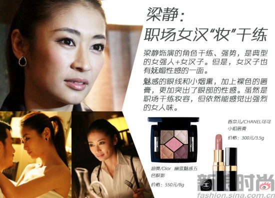 梁静饰演的角色干练、强势,是典型的女强人+女汉子。但是,女汉子也有妩媚性感的一面。魅惑的眼线和小烟熏,加上裸色的唇膏,更加突出了眼部的性感。