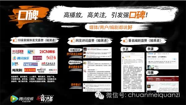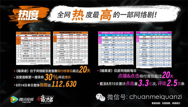 由腾讯出品、慈文传媒集团合作拍摄的网剧《暗黑者》第一季横扫网络,播放量总计突破3.7亿,覆盖2100万独立用户,达到了卫视联播大剧量级,并雄踞各大网络榜单第一位,凭借高点击、高热度以及高口碑的优异成绩,《暗黑者》成功抢占了原创网剧的三大制高点,成为全网热度最高的网络剧。 8月27日,该剧在京召开腾讯研讨会暨全民制片人开启《暗黑者》第二季活动,多位主创、行业专家、媒体人以及观众也就该剧的角色、剧情、商业模式等进行了深度探讨,《暗黑者》的主创团队也表示会不断以各种方式,把各方好的意见和建议加入到第二季的创作之中,让所有关注暗黑者的观众都成为该剧的制片人。制片方还透露,陆毅将加盟《暗黑者》第二季。 看数据: 《暗黑者》改编自有“中国东野圭吾”之称的周浩晖的畅销小说《死亡通知单》。是一部按照美剧形式拍摄的国产季播悬疑剧,国际化视野、世界级制作。在风格设定上,依据大数据分析目标受众特质,用高智商、怪咖、逗比等形式,塑造了一群充满了各类缺陷的问题精英,刻画出了一场关于生死与真相的较量,在一个个迷宫般的案情中,探究了人性深处的罪与罚。正符合了年轻化群体搞怪、富于朝气的一面的,时尚的触点以及极具冲击力的场景,都让人有耳目一新之感。大数据引来“优质受众”,第一季播出以后好评如潮,《暗黑者》很快刷新各类网剧数据。 数据显示,自6月10日开播起,《暗黑者》播放量便一路高企,截至研讨会当天,全剧播放量成功突破3.7亿大关,并覆盖2100万独立用户,这一数据已经达到了卫视联播大剧的量级。网络剧百度指数排行榜显示,《暗黑者》位于网络剧排行榜第一位超过20天,百度指数更一度保持30%的环比增长,8月14日单日整体指数超过11.2万。同时网络剧媒体播放和点击排行榜也显示,《暗黑者》点击量超过《万万没想到》第二季、《水浒学院》、《匆匆那年》等热播网络剧,雄踞榜单首位超过20天,8月15日点击量达3.3亿次,评论量达2.5万条。 品口碑: 出品方腾讯视频实现了《暗黑者》话题营销步步紧跟。开播以来,凭借着引人入胜的剧情,高品质的制作水准,不仅点击人数一再突破,网友讨论热度也是只增不减。百度贴吧关注逾2万,发帖总数超过25.6万,微博搜索量近110万条。在此基础上,为了提升《暗黑者》口碑热度,他们根据剧情的不断推进,节点把控,话题营销。比如世界杯期间,他们实时掀起了世界杯的话题热潮,“世界杯死亡通知单”、 “郭京飞带你一起看世界杯”和“死亡小组”等话题不断抛出,并借势世界杯大事件发布微活动,取得了良好的互动效果。 自开播以来,也不断吸引着众多演艺界明星的目光。从人气演员袁弘、陆毅到著名编剧于正,各路明星都在为《暗黑者》塑造高口碑,全力推荐《暗黑者》的名人明星包括姚晨、陈思成、佟丽娅、闫妮、孙茜、杨蓉、陈铭章、甘露、李倩等等。 截至第一季结束,在百度电视剧风云榜上,搜索指数直逼7.4万。而在口碑数据上,《暗黑者》口碑成绩一直处于高位,豆瓣评分达到8.0分,腾讯视频评分更是拿到了9.4的罕见分值。 《暗黑者》的高播放和高关注,引发了媒体、用户、剧评人的强口碑。新华网、中国青年报、《南方都市报》、网易娱乐、新华娱乐、21CN娱乐等各大新闻媒体不间断发文盛赞《暗黑者》。“情节紧凑且刺激”、“看完意犹未尽”、“很有看点”则成为网友贴给《暗黑者》的主要标签。 此外,众多剧评人也纷纷为《暗黑者》点赞,李潇指出《暗黑者》打破了段子、包袱,碎片化的桥段窠臼,有更大的野心,在人物塑造上有了更大的突破。知名编剧于正评价《暗黑者》的故事环环紧扣,导演手法、演员表演都有新意,“是一部诚意之作”。而冯骥更是评价说:“《暗黑者》是腾讯出品剧的一小步,却是中国网络剧的一大步。” 说观点: 《暗黑者》第二季开启了全民制片人时代。这也许只是万里长征的第一步,但它跨出了坚实的第一步,在网剧,甚至影视剧中,都有着指导及借鉴意义。 第一:《暗黑者》向传统产业渗透了“互联网+”的模式。 粉丝可以通过外部环节融入、渗透到影片的各个环节。然后进一步向全产业链延伸,彻底改变网剧、影视剧的开发创作模式。 第二:《暗黑者》警示了“天外飞仙”发生的可能。 YY真的有可能挑战新东方吗?YY官方宣称,今年要从新东方挖走2000位老师。微创新研究中心创始人金错刀说:“为什么现在传统企业很痛苦?因为他们突然发现最大竞争对手是‘天外飞仙’。” 全民制片人就是传统剧制作的“天外飞仙”。 “腾讯出品一小步,网络自制一大步”,《暗黑者》开启的是一个新制作时代。 第三:放大舆论影响力。 《暗黑者》充分运用媒体的力量,占领信息传播制高点。在充分向传统媒体借力的基础上,借用微博、微信等平台,以互动、互融的方式,扩大受众规模、“用户”规模。坚持差异化策略,话题不断,让自身优势不断放大。 第四:把控优势。 业内人士说,能形成现象级传播的一定是影视剧。而网剧作为后起的大众化产品,用户参与门槛低,且容易形成共鸣,同时最为关键的是,用户群覆盖很广;而且这些受众,也是最终消费网剧产品的用户,拥有双重保障;在创作阶段,可以加入用户的参与共同设计内容。剧本的创作、演员的甄选、场景的设计,都可以通过网民参与决策;在营销阶段