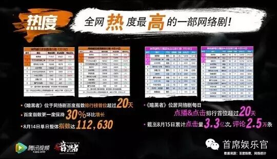 在你的印象中,热播网络剧=什么?《万万没想到》?《爱情公寓》?《屌丝男士》? 《首席娱乐官》发现,最近朋友圈中流行的,已经不再是这些秀“逗比”下限的网络轻喜剧了,而是一部秀“烧脑”上限的,名叫《暗黑者》的侦探悬疑剧。 整个第二季度,视频网站的网络剧实现了大爆发。《首席娱乐官》在8月27日召开的腾讯研讨会暨全民制片人开启《暗黑者》第二季活动上了解到,8月14日的网络剧百度指数排行榜显示,共有8部剧集整体网络指数过万,其中腾讯出品的《暗黑者》位于网络剧排行榜第一位超过20天,百度指数更一度保持30%的环比增长,8月14日单日整体指数超过11.2万。 同时网络剧媒体播放和点击排行榜也显示,《暗黑者》点击量超过《万万没想到》第二季、《水浒学院》、《匆匆那年》等热播网络剧,雄踞榜单首位超过20天,8月15日点击量达3.3亿次,评论量达2.5万条。凭借精彩的剧情和高水准的制作,《暗黑者》点击量成功突破3.6亿,并雄踞各大网络榜单第一位。 与此同时,网友对《暗黑者》话题讨论热度只增不减。百度贴吧关注过2万,发帖总数超过25.6万, 搜索《暗黑者》的微博量近110万条,在百度电视剧风云榜上,搜索指数直逼7.4万。而在口碑数据上,《暗黑者》口碑成绩一直处于高位,豆瓣评分达到8.0分。 这些数据有点出乎小官的意料。要知道,《暗黑者》不过是一部网络剧而已,但口碑和热度却超过了同期播出的很多国产电视剧,甚至网络神剧《万万没想到》都被它甩在了身后,这让《首席娱乐官》对这部剧产生了很大的好奇,于是深度来开扒一下这部被誉为不以搞笑取胜,反而尊重观众智商,走“烧脑”路线的网络自制剧是怎么取得这么好成绩的。 《暗黑者》诞生背景:“中国最高智商”犯罪小说 《暗黑者》之《死亡通知单》改编自周浩晖的同名小说,一群身怀绝技却又颇具奇葩特色的警务人员组成的侦探小组,与暗黑者DARKER进行着一番又一番的生死较量。虽然剧集由一个个小故事构成,但高潮却接二连三,悬念也目不暇接,当然,也有些幽默甚至无厘头的桥段穿插其中,从而平衡了剧集氛围。 《暗黑者》改编自有“中国东野圭吾”之称的周浩晖的畅销小说《死亡通知单》。这位毕业于清华大学的工科硕士擅长悬疑小说,其中以“刑警罗飞”系列独步悬疑江湖,至今已先后完成心理悬疑小说、推理悬疑小说、美食传奇小说、情感悬疑小说、武侠悬疑小说等类型多部精彩作品,达百万余字。他的作品大多气氛诡异、悬念迭起、场面大气、结尾多令人发省,在国内悬疑小说界独树一帜,受到众多读者追捧。这部有“中国智商最高的社会犯罪小说”之称的小说共分为三部,分别为《死亡通知单》,《死亡通知单之二宿命》和《死亡通知单之三离别曲》。 对于熟悉日本侦探小说历史的读者来说,“东野圭吾”是一个如雷贯耳的名字。他的《白夜行》被搬上大荧幕多次,依然是最好看的侦探剧之一。反观中国,不仅缺乏像样的侦探剧,连像样的侦探小说都寥寥,从这点看来,《暗黑者》的确起点上就很高,据说周浩晖的原著就拥有大批死忠粉,因此为这部剧的收视基础做了保证。 《暗黑者》赢得3.7亿点击率的秘诀不仅限于此。演员阵容也是一大亮点。 《暗黑者》启用《龙门镖局》班底,云集当红明星,阵容华丽。“大当家”郭京飞化身神探罗飞,带领“吕青橙”(李倩饰演)法医梁音以及“女特种兵”(甘露饰演)心理学家穆剑云屡破奇案,解开一个又一个谜团。“奇葩”专案组中还有扑克脸组长韩灏、“警界耻辱”尹剑、“暗黑萝莉”梁音、“网游超人”曾日华以及不说话先动手的熊原。 从人物表演看,郭京飞、甘露、李倩、李岷城、宿丹等年轻实力派将舞台表演的魅力延伸到剧中,略微夸张的表演风格,使观众感受到新鲜。还有网友在网上欢乐吐槽,“编剧大人,快给罗飞买粉底吧!”。可见,网络剧也有网络剧的好处,就是观众都特别宽容道具的简单,但不允许粗制滥造。 侦探剧不严肃,新青年娱乐气息扑面而来 虽然主打的是“侦探”题材,但制作方相当清楚,如果网络剧拍的过于严肃,那将会变成另一部《重案六组》(当然,此处不是贬义),失去了网络剧的传播优势——这个引爆点,便是“娱乐”。娱乐性质的片子比严谨的推理片更具传播力。 有豆瓣网友详细分析了剧中各个人物的角色和心理: 罗飞---喜欢喝酸奶的分裂忧桑且逗比的内分泌紊乱的犯罪学教授 梁音---迷恋死亡黑暗元素的哥特萝莉属性的验尸官 尹剑---身材柔弱但观察入微的痕迹学达人 熊原---外表恐怖但却异常喜欢萌系宠物的爆破组炸弹拆卸专家 韩灏---总在纠结而纠结的专案组组长。 曾日华---负责网络方面情报收集的黑客专家。 薛天---看似正常的私人理财顾问 周皓---习惯性拍马屁,但却经常拍到马腿上的二队逗比队长。是韩灏在网游战场的好基友。 丁局长---自我感觉良好具有唐僧潜质但有些可爱的老爷。 DARKER---精通各种炸弹,机关,黑客等物理技术,擅长心理,犯罪,战略高智商布局,到最后准确无误的实施。到最后每次相安无事的逃脱,他是谁,他是一个人吗,还是一个组织? 这些丰富而有个性的人物设定体现了编剧的水准。“大家都是有各种属性组成的新时代新新人类。”可见,“新新人类”才是《暗黑者》流行起来的真正核心。 《暗黑者》开启第二季,网络剧商业模式能否升级? 对于