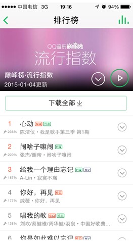 - 《我是歌手3》QQ音乐试听破5500万 陈洁仪问鼎巅峰榜华丽逆袭2015-01-06 12:01:36