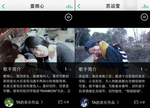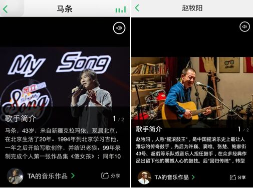 只看《中国好歌曲》还不能尽兴?想搜集他们所有歌曲?想第一时间关注最新发布?QQ音乐作为独家试听版权平台,为《好歌曲》中的独立音乐人提供了线上展示机会:《好歌曲》独家入驻QQ音乐的音乐人专区,乐迷不仅可以在第一时间欣赏到最新的原创音乐,还可以透过音乐了解音乐人的心路历程,与亿万人一起听原创好歌曲。 QQ音乐的音乐人专区是专为原创音乐人打造的展示平台,自上线以来,汇聚了许多实力派原创音乐人,在这里,他们不受地域、渠道的限制,可以尽情展示各具特色的原创音乐和独特嗓音。而作为目前最火热的歌曲原创节目,《中国好歌曲》正是看中了QQ音乐大平台、多用户、重原创的三大原因,不仅与QQ音乐达成独家版权合作,更进一步与QQ音乐的音乐人专区独家牵手,让《好歌曲》中的独立音乐人拥有更广阔的天地。 如果说,《中国好歌曲》给了原创音乐人一个展示的舞台,那么作为线上独播平台及专为原创歌曲打造音乐人专区的QQ音乐,就是让原创音乐得以“保存”的线上平台。目前,QQ音乐音乐人专区已独家上线《中国好歌曲》中包括马条、赵牧阳、杭盖乐队、罗中旭、苏运莹、雷雨心、刘润杰等诸多音乐人,在这里你不仅可以将你对他们的热爱从《好歌曲》延续到QQ音乐,还可以享受到更多的原创音乐和了解音乐人背后的故事。 作为全网领先的音乐平台,QQ音乐的音乐人专区不仅给用户带来了最纯粹的音乐世界,更为音乐人提供了展示的平台和空间。如果你喜欢听原创歌曲,来QQ音乐,无论是淳朴的民谣还是热血的摇滚,你都能找到属于自己的style;如果你是默默无闻的原创音乐人,来QQ音乐,申请入驻音乐人专区,让原创音乐受到更多人的关注和喜爱!
