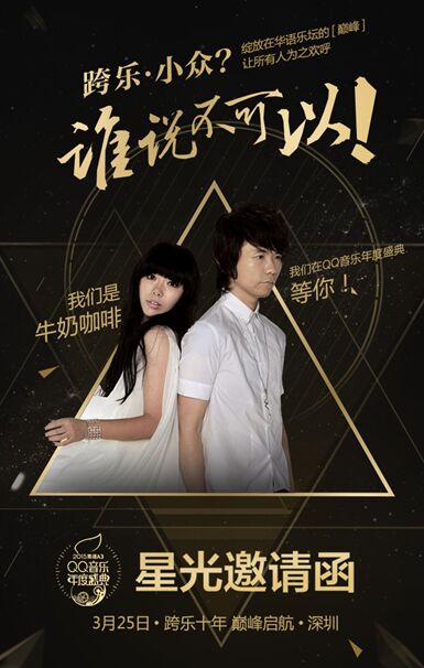 3月25日,2015QQ音乐年度盛典暨巅峰榜颁奖礼将在深圳巅峰启航。线上投票、抢票活动均已上线,想让你喜欢的明星3月25日问鼎巅峰,想亲临星光璀璨的颁奖礼现场,请关注QQ音乐,参与投票/抢票活动。QQ音乐巅峰榜人气奖项“全民公投”已火热开启,以网络试听数据为依,以用户喜好为本,秉承真实、透明、公平、公正的原则, QQ音乐巅峰榜已成为引领潮流的全民数字音乐风向标,也因其权威性成为粉丝们的“必争之地”。用数据证人气,“全民音乐公投”、“全民音乐盛宴”,等你开启! 小清新暖人组合牛奶咖啡与您相约2015QQ音乐年度盛典 2014年,小清新暖人组合牛奶咖啡用一首《偶尔还是会想起你》告别青涩,站在现实世界的门口。从青涩到成熟,牛奶咖啡用他们的音乐书写了一幅完整的成长诗篇,也用自己独有的温暖魔力获得劲歌王金曲最佳飞跃组合奖。3月25日,牛奶咖啡邀您一起关注2015QQ音乐年度盛典,共享音乐盛宴! 牛奶咖啡来了,你在哪? 星光邀请函——牛奶咖啡 有人说:才华面对等待,只能遥遥失落,成为市场的灰烬。 有人说:小众音乐曲高和寡,你们的旋律、只有自己懂得。 但,谁说小众音乐,不能绽放在华语乐坛的巅峰? 让所有人为之欢呼? 我们是牛奶咖啡,我们在QQ音乐年度盛典等你! 小众?谁说不可以! 关注2015QQ音乐年度盛典 将于2015年3月25日在深圳开幕的“跨乐十年,巅峰启航”2015QQ音乐年度盛典暨巅峰榜颁奖礼,是由腾讯旗下中国互联网领先的正版数字音乐服务平台QQ音乐举办的,华语乐坛首个以互联网用户大数据为评奖标准的顶级音乐盛典。秉承全民公投、用户为依,以数据化、社交化、大众化为特点,打造真实、权威、公平、公正的中国数字音乐风向标与权威典范。 在QQ音乐诞生十周年之际,2015QQ音乐年度盛典暨巅峰榜颁奖礼不仅是群星汇聚全民共赏的音乐盛会,也是记录乐坛发展里程,开启数字音乐新生态的音乐年鉴,致敬经典,唱响未来。当数字音乐发展成为承载音乐产业的新高度,盛典也邀请大家与QQ音乐共同扬帆起航,探寻数字音乐新航向。