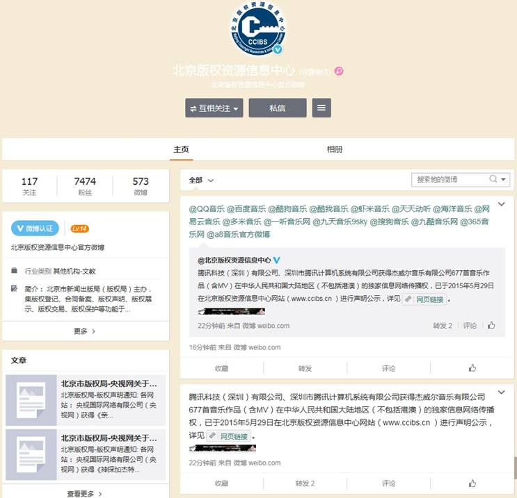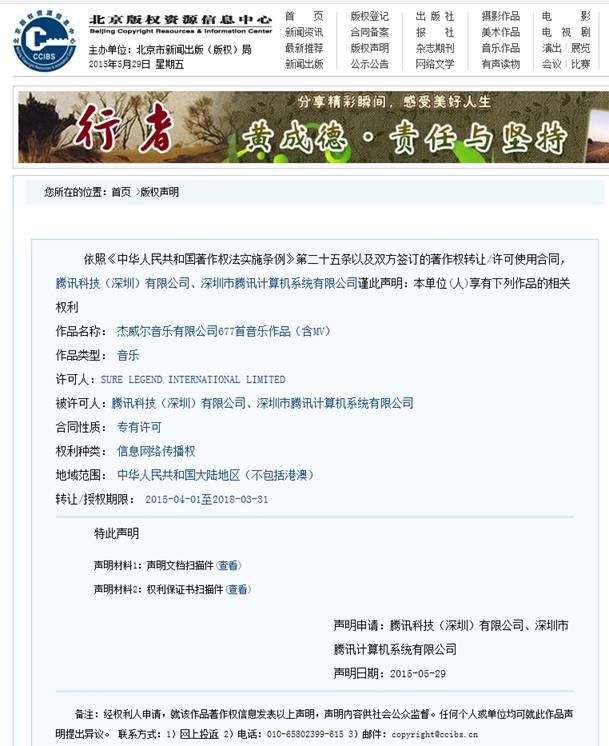 - 版权局公示声明 周杰伦公司677首歌曲独家版权归属腾讯2015-06-02 10:06:22