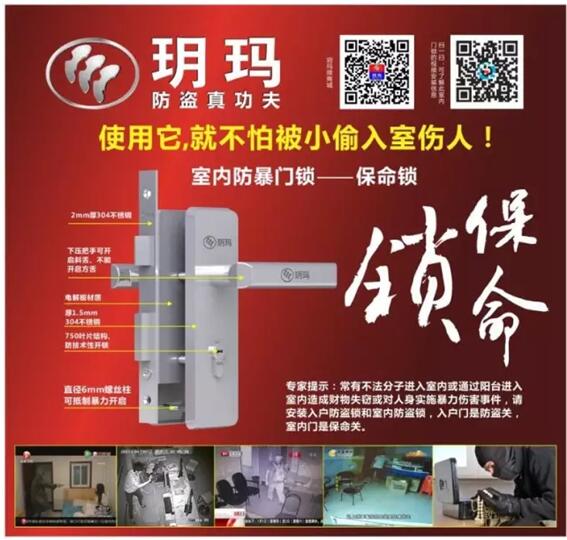 近日又一重磅消息来袭,江西新闻频道《新闻说报》与玥玛锁具联合推出“千元锁芯免费送”公益活动!不仅为大家讲解锁具相关知识,还将为幸运观众免费检测锁具安全等级,并送上千元精品锁具! 什么?你说你家有锁不需要? 你知道吗?锁具有等级之分,A级锁几秒被打开!老式社区仍用 A 级锁存隐患小偷频繁光顾! 你家是新房不需要换锁? 你以为新房门锁看起来高大上这就安全了吗?各种开锁工具令你意想不到! 除了家用防盗锁,其他锁具看起来是否真的安全呢? 电动车摩托车一不小就给人搬走了? 办公室用的保险柜那么重,是否真的保险? 智能锁方便智能,那是否防盗呢? 除了防盗锁,窃贼通过阳台攀爬进入卧室,一不小心还容易失财伤人,该如何预防? 看到这些你是否也开始担心防盗安全?别 担 心 !为了让大家过个好年,《新闻说报》与玥玛锁公益活动进行中,千元锁具免费送!!! 参与方式如下: 1、关注江西新闻频道以及玥玛锁具微信公众号。 2、编辑“我要换锁”,并附上您的姓名、住址和联系方式。 被抽中的幸运观众将免费获得上门检测和更换安全锁芯的机会!另外每天还会抽出5名幸运观众,送出精美锁具,让您“锁到之处、安全放心”! 换把安全锁安心过大年,还在等什么?小伙伴们速度了!