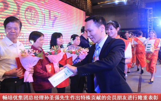1月3日,由广州源仁生物科技有限公司举办2017健康中国2030.畅培优居家养老健康进万家活动在中山市永安新城皇冠假日酒店隆重举行。本次活动公司全体员工,各子公司同仁、各区域销售代表及销售经理,广大客户与公司领导欢聚一堂,共度联欢。 时光飞逝,岁月如梭,转眼间忙碌的2016年已过去,充满期待的2017年向我们走来。新的一年,孕育新的目标和希望。 公司董事长周善永先生和总经理孙圣强先生到会祝贺并发言,同时到会的还有中南海首长级保健专家杨长江教授、原广东省工商局副局长冯列明先生,,原广州市食品药品监督管理局局长金建忠先生,广东省保健食品行业协会会长彭平先生,广州风声文化传播有限公司总经理湛堂勇先生等参加了本次联欢活动。 领导们大合照 孙总发言 公司总经理孙圣强先生致贺词并介绍了现场嘉宾,紧张忙碌的2016年已经过去,公司在董事会领导下,公司领导班子的带领下,在全体员工的努力下,取得了前所未有的销售成绩。希望借助全体员工共同努力,圆满完成公司的2017年各项公司目标,预祝大家合家欢乐,身体健康,万事如意. 相关专家发表讲话 周董和八姑、炳哥合影 与公司领导合影 活动当天,《七十二家房客》中的“八姑”扮演者黄伟香老师和“炳哥”扮演者彭炽权老师出席了2017健康中国2030.畅培优居家养老健康进万家活动,并进行了精彩的演出,现场在两位嘉宾的精彩表演下气氛反应热烈。 孙总给优秀会员颁奖 随后,集团领导宣读了“畅培优部分年度优秀会员”表彰仪式,并为优秀会员颁发了证书和奖品,鼓励他们戒骄戒躁,在新的一年起到模范带头作用,做出新的贡献。 活动现场人山人海 公司为此次联欢会带来了形式各异、让人目不暇接的表演,舞蹈、唱歌、舞台剧等节目, 八姑、炳哥舞台表演 五彩缤纷,精彩纷呈,不断掀起年会的高潮。联欢会不仅给大家带来了欢声笑语,同时也让公司与客户之间彼此的心更加贴近。公司员工与客户亲情互动、激动人心的表演活动,让歌声、掌声、欢呼声一直在会场上荡漾。整场联欢会高潮迭起,呈现出畅培优这个大家庭的欢乐和谐。 光辉灿烂的2016年过去了,充满希望和挑战的2017悄然来临。在过去的一年里我们微笑过、艰难过、也收获过,面对2017,我们满怀憧憬,激情澎湃,让我们一起用信心和勇气,昂首阔步,去书写一个更加灿烂的未来。