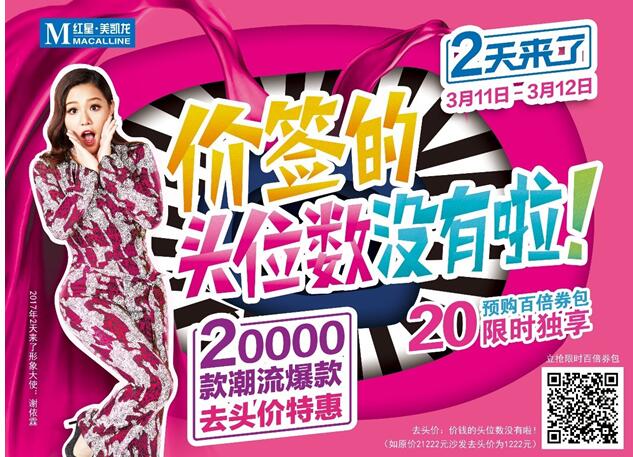 陈坤、张继科、 黄磊、郑元畅、 吴磊、盛一伦…… 以上男神通通撩过…… 讲真, 综艺女王谢依霖才是人生赢家好吗! 在颜即正义的娱乐圈,谢依霖简直是一股靠性格实力圈粉的清流。 当得了段子手,演得了小时代, 正能量满格,智力体力双高, 没有偶像包袱,全场笑点担当。 这样清新脱俗不做作的谢依霖就像两天来了的红星美凯龙! 折扣不磨蹭,来点痛快的! 价签的头位数没有啦! 2 天 来 了 要知道,红星美凯龙“2天来了”是家居界的购物狂欢节,堪称家居界的双十一! 为了配合今年2天来了“价签的头位数没有啦”前所未有的惊天折扣,天生喜剧细胞会搞事的谢依霖成为了今年2天来了当仁不让的活动代言人! Hold住姐代言的2天来了, 也是史无前例的超大手笔, 各位看官请一定要hold住! ▼ ONE ▼ 价签去掉头位数! 20000款新品! 八折、五折、抹零…… 和直接去掉价签头位数的大刀阔斧相比 简直是隔靴搔痒! 原价15680的沙发现在只要5680块! 原价2375的马桶现在只要75块! 这,这,这丧心病狂的力度! 红星美凯龙狠起来,连自己钱也不赚! *图片仅供参考,请以各商场实际活动内容为准。 全国红星美凯龙商场总计有20000款新品参与这次“价签的头位数没有啦”的优惠活动! 不用担心抢不到,你可以提前通过红星美凯龙微信服务号进入城市频道,挑选相应的产品抢券预购,活动2天可凭券至相应商场购买。 抢一套少一套!可点击文末“阅读原文”参与活动。 ▼ TWO ▼ 翻番100倍! 20元翻到2000元 短短数日,将20元变成2000元,任何XX宝都做不到,但红星美凯龙可以! 提前购买20元付费券包,2天活动当天即可享受总价值2000元的优惠抵扣! ▼ THREE ▼ 满额再减! 2亿现金为你花! 一旦认真起来,红星美凯龙简直停不下来! 这些优惠还不算完,满额还要再减! 两品牌开单满22222元,成交价再减300元! 三品牌开单满32222元,成交价再减650元! 预计此次活动期间总计将减免约2亿元现金,通通由红星美凯龙活动商场和品牌商为你买单! ▼ FOUR ▼ 邀你尝新! 万元新品免费试用! 看,你喜欢的品牌出新款产品了,可不知道和自己家搭不搭。 不要犹豫,2天期间,红星美凯龙活动商场预备万元最新款产品供你们免费尝新! *图片仅供参考,请以各商场实际活动内容为准。 这样给力的2天来了,完全把持不住! 可谢依霖还要继续搞事! TVC视频地址https://v.qq.com/x/page/s0379anb9cy.html 你以为这就完了?拿衣服! 以上仅仅是彩蛋!!! 综艺女王谢依霖到底和2天来了搞出了什么大事来? 3月6日谢依霖首支单曲MV全球首发! 将完整揭秘! 据说她为此次2天来了献出超多个人首秀:又cos,又唱歌,又跳舞,还将在3月11日空降红星美凯龙上海真北商场,3月12日空降红星美凯龙北京朝阳路商场,并将现场揭秘2天来了更多惊喜! 还在等什么? 快点击文末“阅读原文”参与活动! 阅读原文H5链接 http://2tianlaile.ne.cagoe.com/
