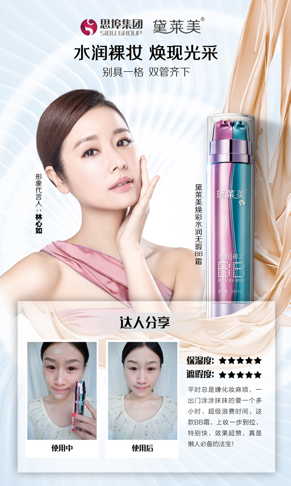 黛莱美裸BB霜重磅出击 今晚敬请锁定旅游卫视 如何成为美得自然的“素颜女神”?旅游卫视今晚9点档《美丽俏佳人》节目将会现场精彩揭秘“素颜女神养成计”,详细解读底妆“神器”——黛莱美焕彩水润无瑕BB霜的高效使用方法,各位MM敬请锁定今晚的旅游卫视哦! 由一线当红女星、知性美女林心如代言的黛莱美焕彩水润无瑕BB霜蕴含桂花花提取物、山茶籽油、肌肽、维生素E,可有效抑制脂质过氧化、淡化皱纹、延缓肌肤衰老、提亮肤色、轻松遮瑕,让暗沉肌肤焕发如粉红钻石般的光彩! 无论你是只有化妆初级水平的“菜鸟MM”,想要避免踩上化妆雷区惹出笑话:还是青睐自然裸妆效果的“美妆高手”,想要打造出天生丽质的美妆效果,黛莱美焕彩水润无瑕BB霜都会是你面部必备的底妆“神器”! 黛莱美焕彩水润无瑕BB霜的瓶身具有很强的丝滑触感和时尚美感,精美的蓝色和紫色双管设计精巧实用,只需一支在手,即可轻松打造出水润无瑕裸妆效果,点亮MM们自然上妆、变身“素颜女神”的美丽梦想!